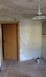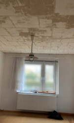 Leider waren hier die Deckenplatten vollflächig verklebt worden und die Entfernung eine echte Qual. Als Belohnung blieb dann eine extrem unebene Decke zurück, aus welcher teilweise bereits die Strohmatten unter dem Putz rauslugten und andererseits großflächig noch Kleberreste übrig waren. Daher entschieden wir uns die Decke lieber abzuhängen, da diese im Vergleich zu den anliegenden Räumen sowieso schon etwas höher ausfiel.