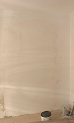 Später klebten wir dann Malervlies an Wände und Decke, in der Hoffnung es würde einige Unebenheiten in der Wand kaschieren. Danach überklebten das Vlies wiederum mit einer grauen strukturierten Vliestapete. Leider hatte das Vlies nicht den gewünschten Effekt gebracht, aber um dies nochmal zu beheben blieb leider keine Zeit mehr.